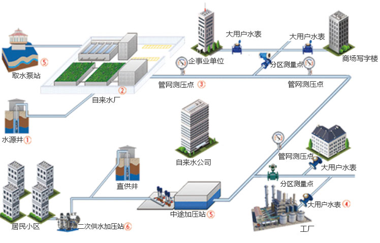 自來水公司從水源地(江河、湖泊、水庫、地下水等)抽水,進入自來水處理廠,經過混凝-沉淀-過濾-消毒(傳統工藝)(現在有少部分水源污染嚴重的地區,加入了臭氧消毒+生物活性炭吸附的深度處理工藝)后,泵入城市輸配水管網系統,最后進入千家萬戶的水龍頭。樓層較高時的輸配水,還需要二次加壓,或設置高位水箱二次供水。